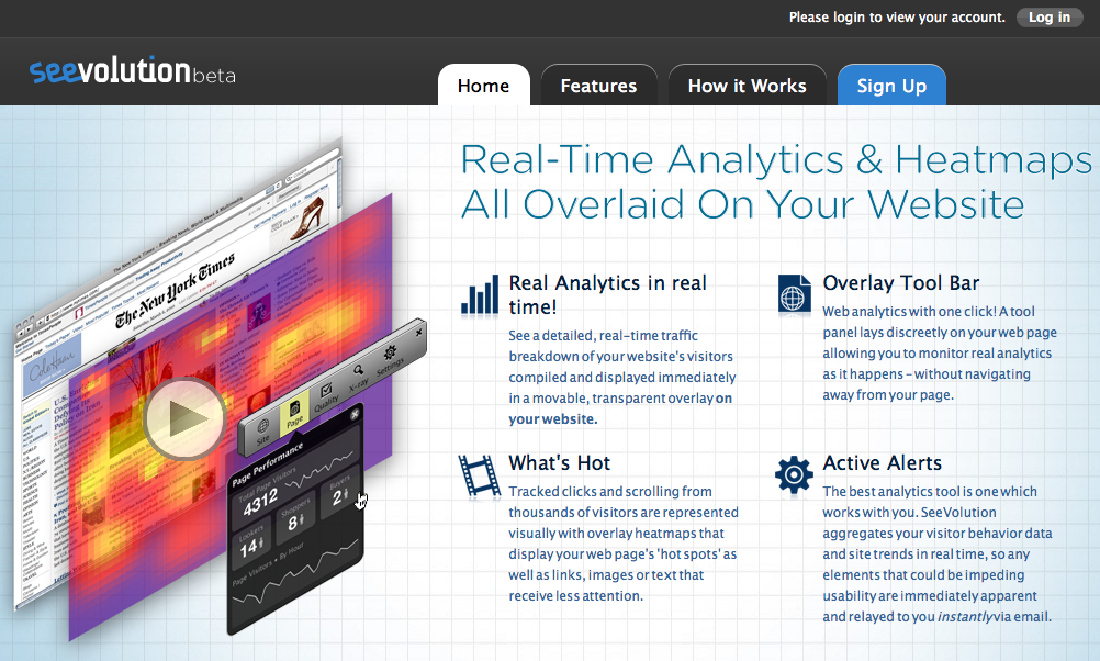 Seevolution er en ny startup, der prøver at give et grafisk overblik over hvor musen har været henne, når en besøgende har interageret med din hjemmeside. Den vigtigste funktion i denne webtjeneste er et heatmap der lægger sig oven på din hjemmeside. Det viser hvor brugeren har klikket, hvor langt brugeren har scrollet ned på siden mv.